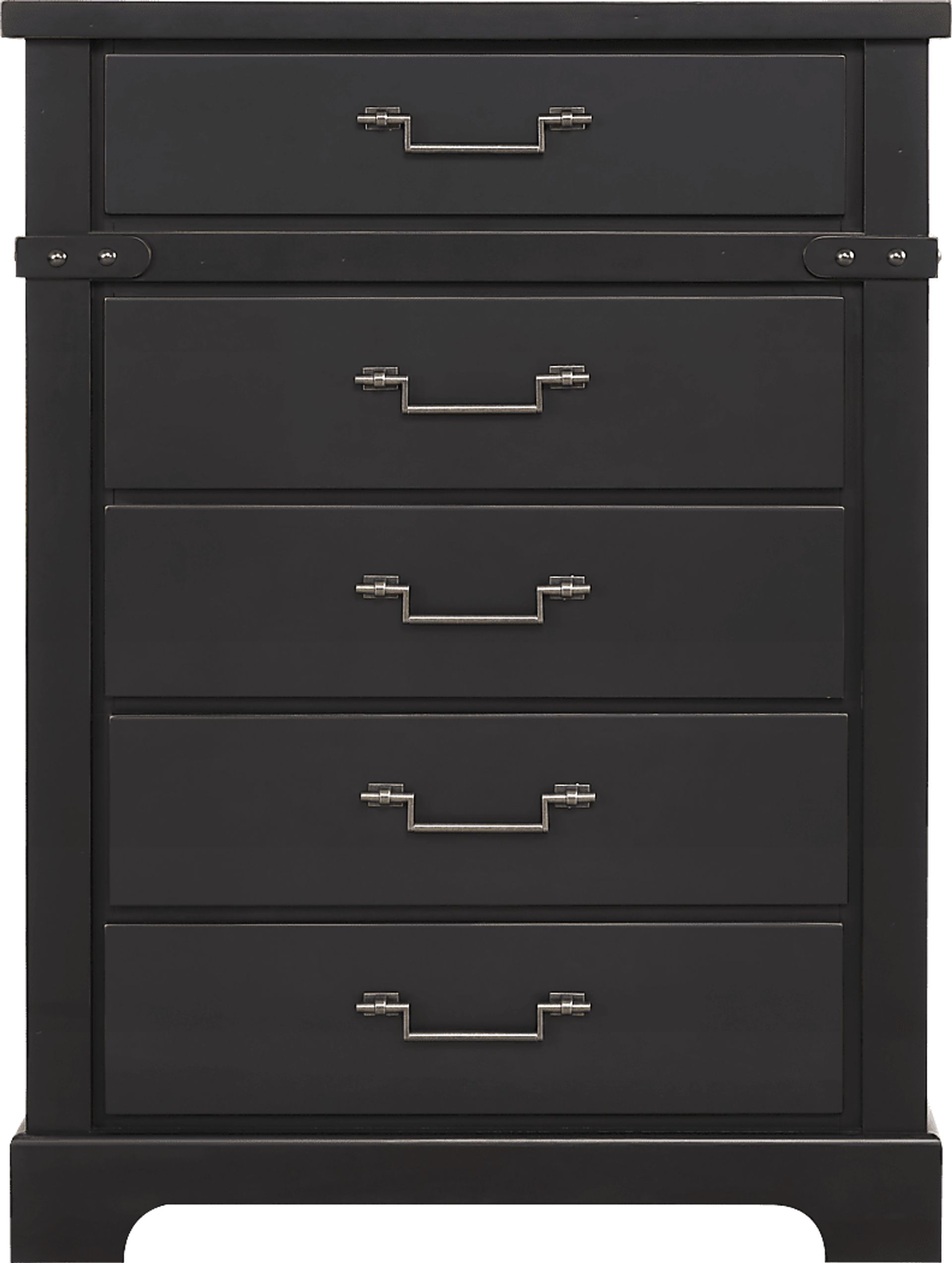 With the thorough care of a master craftsman and the humble grace to match, the Fairhaven chest offers reassuring solace and uplifting style in every angle and detail. This modern farmhouse accent is crafted with birch veneers in black, each edge punctuated with decorative nail treatments. Five drawers feature metal bar pull hardware in an antique brass finish, and scalloped feet provide a poised contemporary appearance.