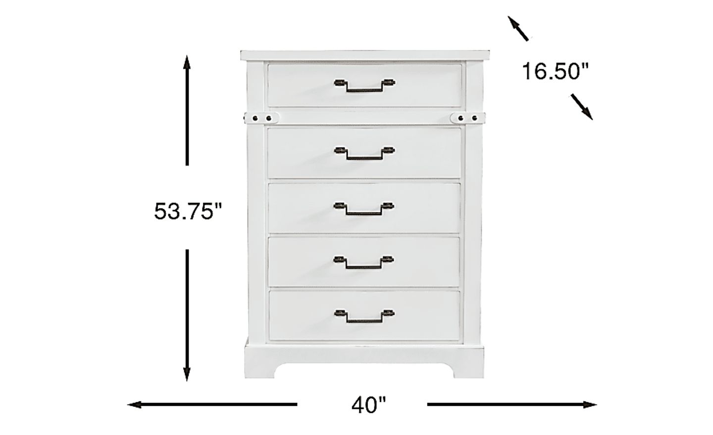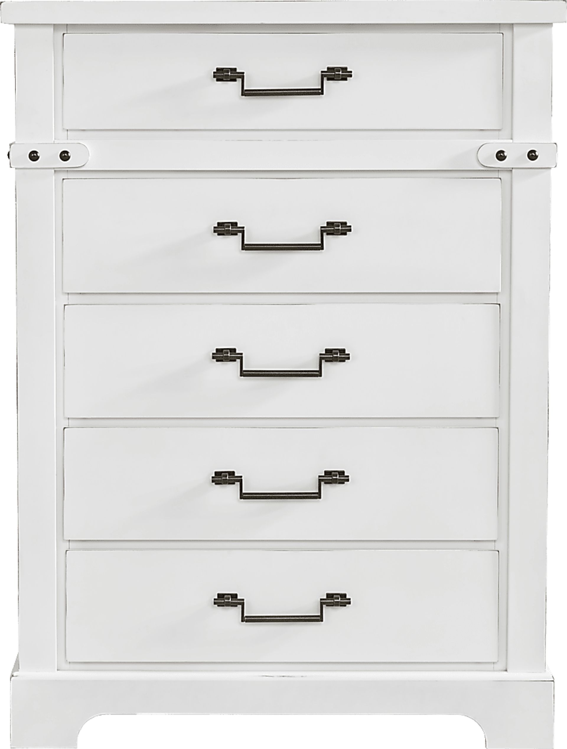 With the thorough care of a master craftsman and the humble grace to match, the Fairhaven chest offers reassuring solace and uplifting style in every angle and detail. This modern farmhouse accent is crafted with birch veneers in white, each edge punctuated with decorative nail treatments. Five drawers feature metal bar pull hardware in an antique brass finish, and scalloped feet provide a poised contemporary appearance.