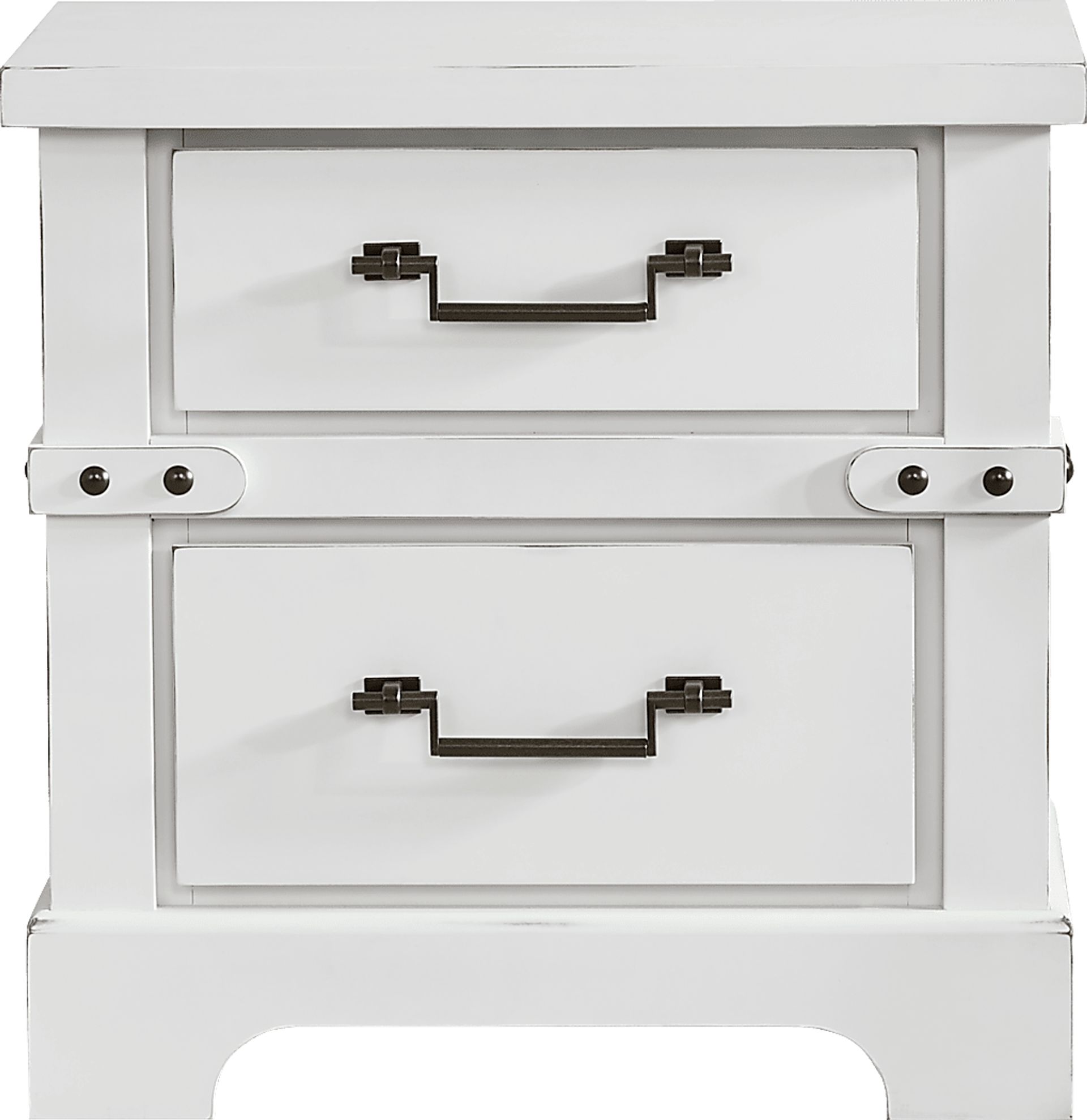 With the thorough care of a master craftsman and the humble grace to match, the Fairhaven nightstand offers reassuring solace and uplifting style in every angle and detail. This modern farmhouse accent is crafted with birch veneers in white, each edge punctuated with decorative nail treatments. Two drawers feature metal bar pull hardware in an antique brass finish, and scalloped feet provide a poised contemporary appearance. Hidden USB chargers add a final touch of convenience to your sleep sanctuary.