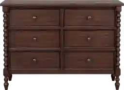 The Fairiprises brown dresser brings timeless design to smaller spaces. It's the perfect solution for compact bedrooms, entryways, or dining areas. Six drawers with metal knobs and velcro-lined boxes offer organized storage, while classic spindle legs add airy elegance. Smooth ball-bearing glides and an anti-tip kit ensure easy use and added safety. Finished in Morocco brown with floor-protecting leg glides. Add space-smart style to your home. Customer assembly is required.
