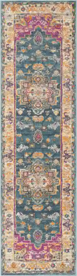 This rug is strategically designed to bridge design styles, combining a time-honored Oriental pattern with a vibrant blue, purple, and gold palette that offers a "youthful appearance." This makes it an excellent choice to complement bohemian or rustic decor. To create a cohesive look, our stylists suggest pairing the rug with natural wood furniture or textured accents that echo the gold and deep blue tones found within the weave.