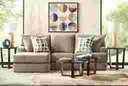 Warmth, style and versatility imbue every inch of the Fallbrook collection, making easygoing relaxation a joyous occasion. Contemporary in style, this sofa chaise is upholstered in soft brown twill fabric and features casual double-stitched seams for a relaxed, tailored look. Subtle wedge arms emphasize its clean, minimalist design, while the coordinating accent pillows add vibrant colors and personality. The floating ottoman completes the ensemble, offering laid-back comfort from wherever you choose. Upholstery: 80% Polyester and 20% Rayon.