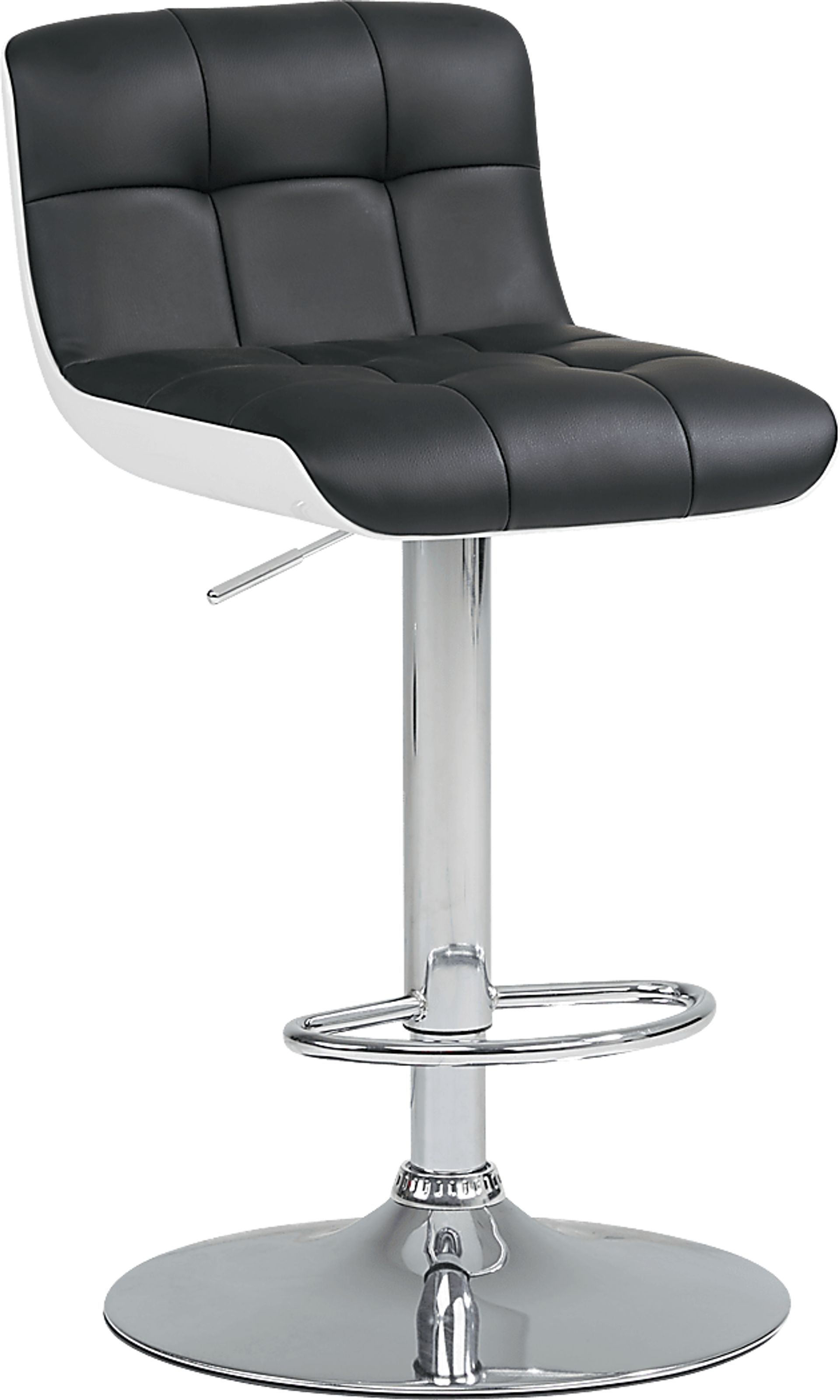 Add sleek, contemporary style to your dining area with the Falsley barstool. Upholstered in leather-like fabric in a classic black color, it features a contrasting white back and tufting detail. The lever activated stool features an adjustable height swivel gas-lift mechanism allowing you to raise and lower the seat from 23 inches to 33 inches from the floor. A chrome finished base offers support.