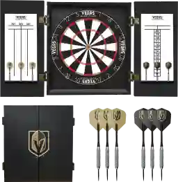 A cabinet serves as both a protective barrier and a stylish furniture piece. Beyond showcasing the Golden Knights team logo, the cabinet doors open to protect your wall from stray darts and missed throws. When not in use, the 3.5-inch deep cabinet neatly conceals the board, allowing the set to blend seamlessly into your home decor or "fan cave."