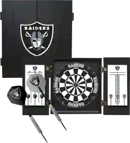 Las Vegas Raiders bristle dartboard cabinet features your favorite team logo and includes a premium 18-inch tournament sized self-healing bristle dartboard. Self-healing bristle dartboards are some of the longest lasting boards on the market, since the holes close up after each dart is removed. This hanging dartboard cabinet will look great in your fan cave or any room that your family and friends gather. Secure the dartboard and you are ready to have hours of enjoyment. Customer assembly required.