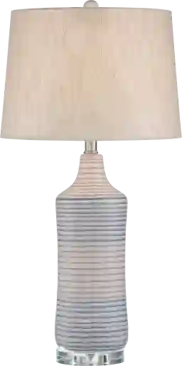 This delightful contemporary ceramic Farlight table lamp has a cylinder bottle shape base in white finish with striped gray and light-blue horizontal accents. The lamp rests on a base of beautiful solid crystal which adds high-end touch to any decor. Topped with a simple beige-gray fabric shade that will complement any room's color scheme. Partial assembly may be required.