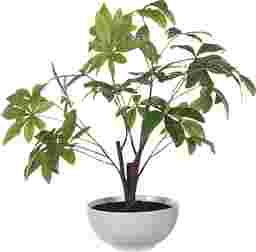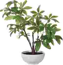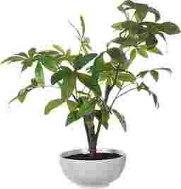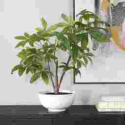 Known for its luck and Feng Shui, the Faun money tree plant features a lush green foliage with an airy quality. Planted into a glossy white bowl with faux soil.