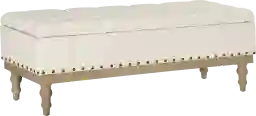 Add classic farmhouse charm with our beautiful Fauz storage bench. Highlight chic traditional styling with button tufting, turned leg and nail head trim. The upholstered padded lid lifts to reveal fully lined blanket storage adding both functionality and good looks. Add the ideal finishing touch to your guestroom, offer a graceful welcome to any entry or create pitch-perfect seating at your dining table. Customer assembly is required.