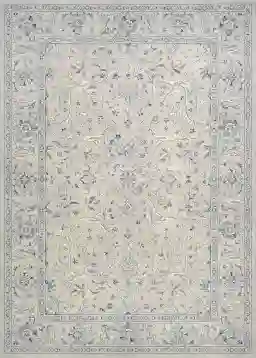 This rug utilizes a "transitional" design philosophy, pairing a classic Persian floral pattern with a modern, updated color palette of light gray and blue. This versatility allows it to ground a traditional room with timeless class or provide a sophisticated, softened contrast in a minimalist, modern interior.