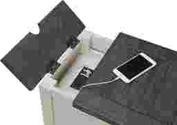 This table features a high-tech charging bank hidden beneath a discreet flip-top cover on the back of the surface. It includes two three-prong outlets and two USB ports, allowing you to charge smartphones, tablets, and laptops simultaneously. This design effectively manages cable clutter by keeping power cords tucked away while keeping your devices within easy reach.