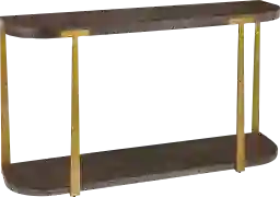 The Felge console table is finished in a rich coffee finished oak veneer with natural wood grain details accented by forged metal columns finished in mottled antique gold. Customer assembly is required.