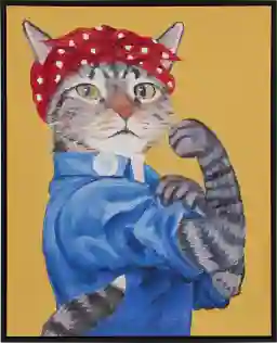 Bring a playful twist to your living space with the Feline Flex wall decor. This charming canvas artwork features a denim-clad cat worker donning a vibrant red and white polka dot bandanna, beautifully framed in black with micro-texture embossing. Two D-ring hangers ensure easy mounting. This resilient and empowering cat wall art merges fun with sophistication for the perfect conversation starter. Cat lover or not, it's hard not to smile. Hang it in your living room, study room or bedroom for home decor. Spot clean. Customer assembly is required.