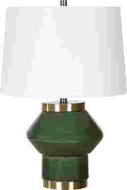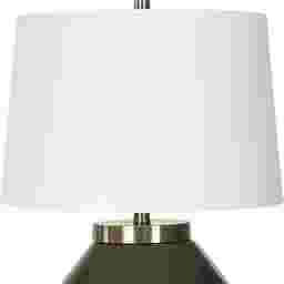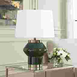 The Fenelon Island Green Lamp showcases a jade green ceramic base accented with antique brass plated details, blending striking design with contemporary elegance. The tapered hardback shade is covered in a crisp white linen fabric. Partial assembly may be required.