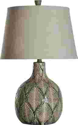 The Fernhill lamp features a curvy bubble-like base in different shades of brown. It features an organic shaped pattern filled with fine lines which resemble leaves' texture. Colors are ranging from light creamy beige to the dark brown tones. The beige shade complements the base and blends in with any transitional decor. Customer assembly is required. Customer assembly is required.