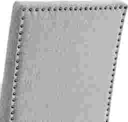 This chair features a sophisticated contemporary aesthetic, characterized by its clean lines and dark wood finish. A standout detail is the elegant nailhead trim that outlines the upholstered back, providing a tailored, high-end finish that complements modern and transitional dining room decors.