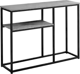 Whether you are tight on space or need to fill that empty spot in your hallway, entryway, living room, bar area, or office space this multi-functional, contemporary style Ferringdon hall console table will easily become your most versatile accent piece. Constructed from quality MDF material, the gray wood-grain look laminated table tops elegantly contrast with the clean simple lines of the solid black metal base. The top is spacious enough to hold a small plant, photos, or decorative objects, while the handy side half shelf at the bottom offers additional storage space for magazines or books. What a practical accent table for any room! Customer assembly is required.