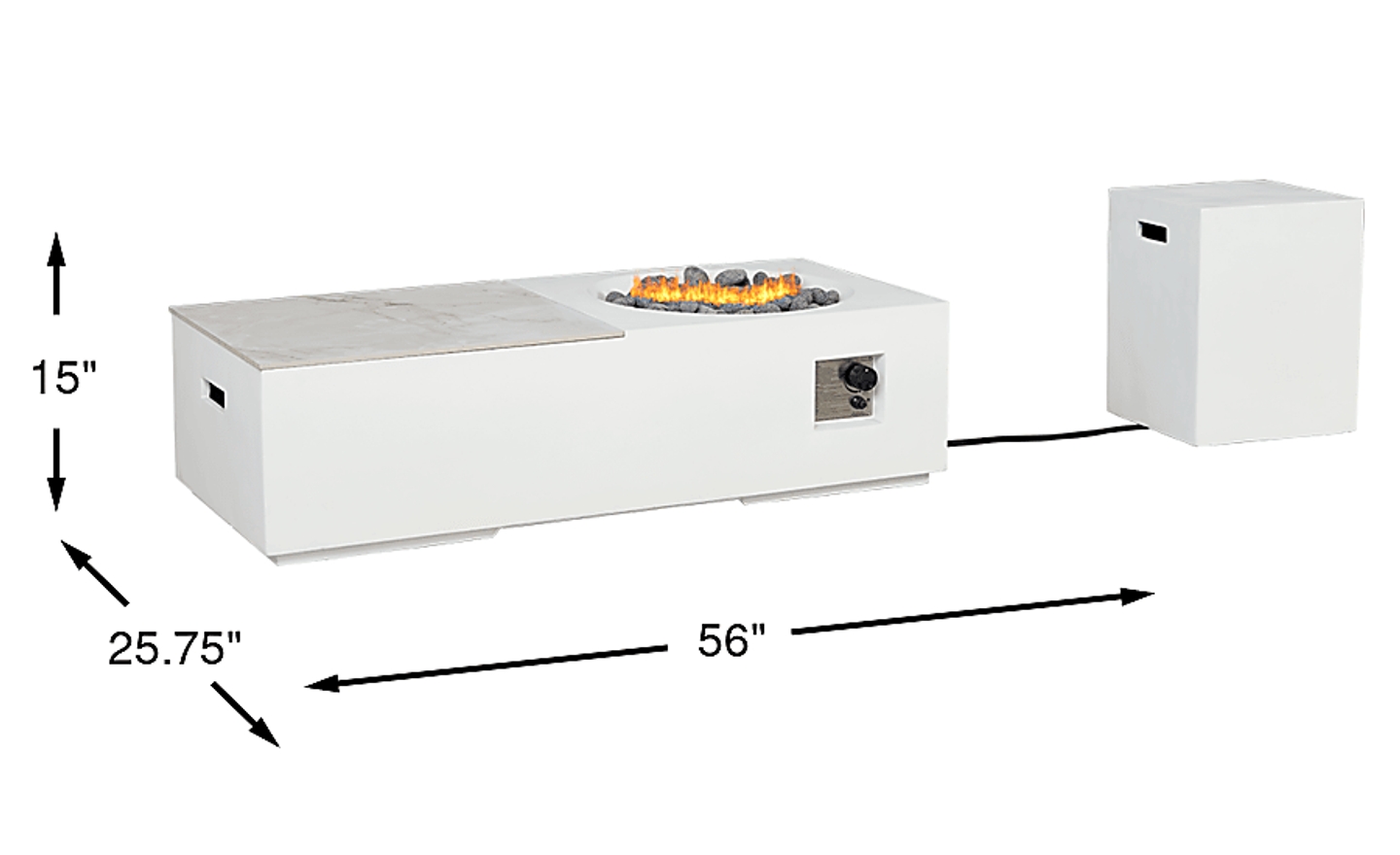 Brighten the mood and light up the smiles of guests and family with the Fiamma fire pit's exquisite touch of modern estate luxury. This backyard essential in white features a timeless rectangle shape made of concrete reinforced with glass fibers for exceptional outdoor durability. An elongated sintered stone top with marble-pattern design offers generous space for drinks and plates while entrancing flames brighten any late-night conversation with 50,000 BTUs of dial-adjustable intensity. Large lava rocks add to the natural appeal, and the included tank cover doubles as a matching end table, keeping fuel covered, elevated and neatly out of the way.