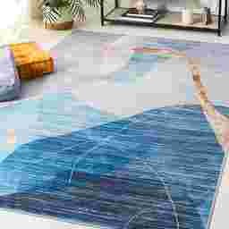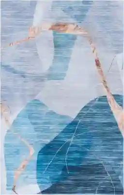 The abstract pattern and sophisticated blue and gold color palette serve as a modern focal point. The gold accents pair exceptionally well with metallic room accessories or warm wood finishes, while the blue tones can complement coastal, transitional, or minimalist decors. Because the pattern is abstract, it adds visual interest without clashing with structured furniture lines, making it a seamless addition to a contemporary home.