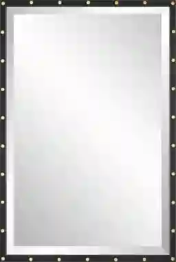 This urban Fiffie industrial design features an iron frame finished in matte black adorned with plated brass smooth screw caps. Mirror has a generous 1 1/4 bevel. May be hung horizontal or vertical. Customer assembly is required.