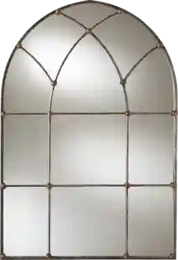 An arched mirror with a window pane design, like this one, is an effective tool for expanding a room visually. By mimicking the architectural look of a traditional window, it reflects light and creates an illusion of depth that makes compact entryways or smaller living areas feel significantly more open and airy.