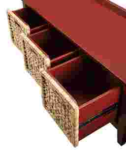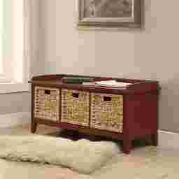 Keep your entryway fresh and organized with the lovely Flavius red storage bench, featuring three spacious brown rattan basket-like drawers. The low-profile design and crisp finish make for charming window seating. This bench is perfectly suited to update the bathroom, dressing area, or living room. From small spaces to wide and roomy, ample interior storage keeps messes tucked away. Some customer assembly required.