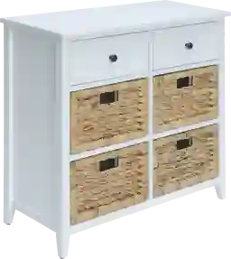 Get exceptional value on the transitional Flavius white accent cabinet. Featuring a rich finish, the drawers and open compartment spaces give plenty of room for storage. This chest looks great with 4 bottom wicker basket front drawers. Some customer assembly required.