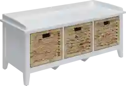 Keep your entryway fresh and organized with the lovely Flavius white storage bench, featuring three spacious brown rattan basket-like drawers. The low-profile design and crisp finish make for charming window seating. This bench is perfectly suited to update the bathroom, dressing area, or living room. From small spaces to wide and roomy, ample interior storage keeps messes tucked away. Some customer assembly required.