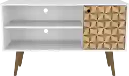 The Flaxmill Mid-Century Modern console is the perfect blend of quality craftsmanship, brilliant design, and purposeful functionality. The white console features light brown door with 3D design on it. The Flaxmill sits on natural finished splayed legs and features 2 open shelf spaces and one hidden cubby to create the ultimate entertainment center perfect for stashing DVDs, board games, electronics, and media accessories. Free standing and easy to maneuver, this piece will mix well with any decor and its artful grooves will create a statement in any space. Customer assembly is required.