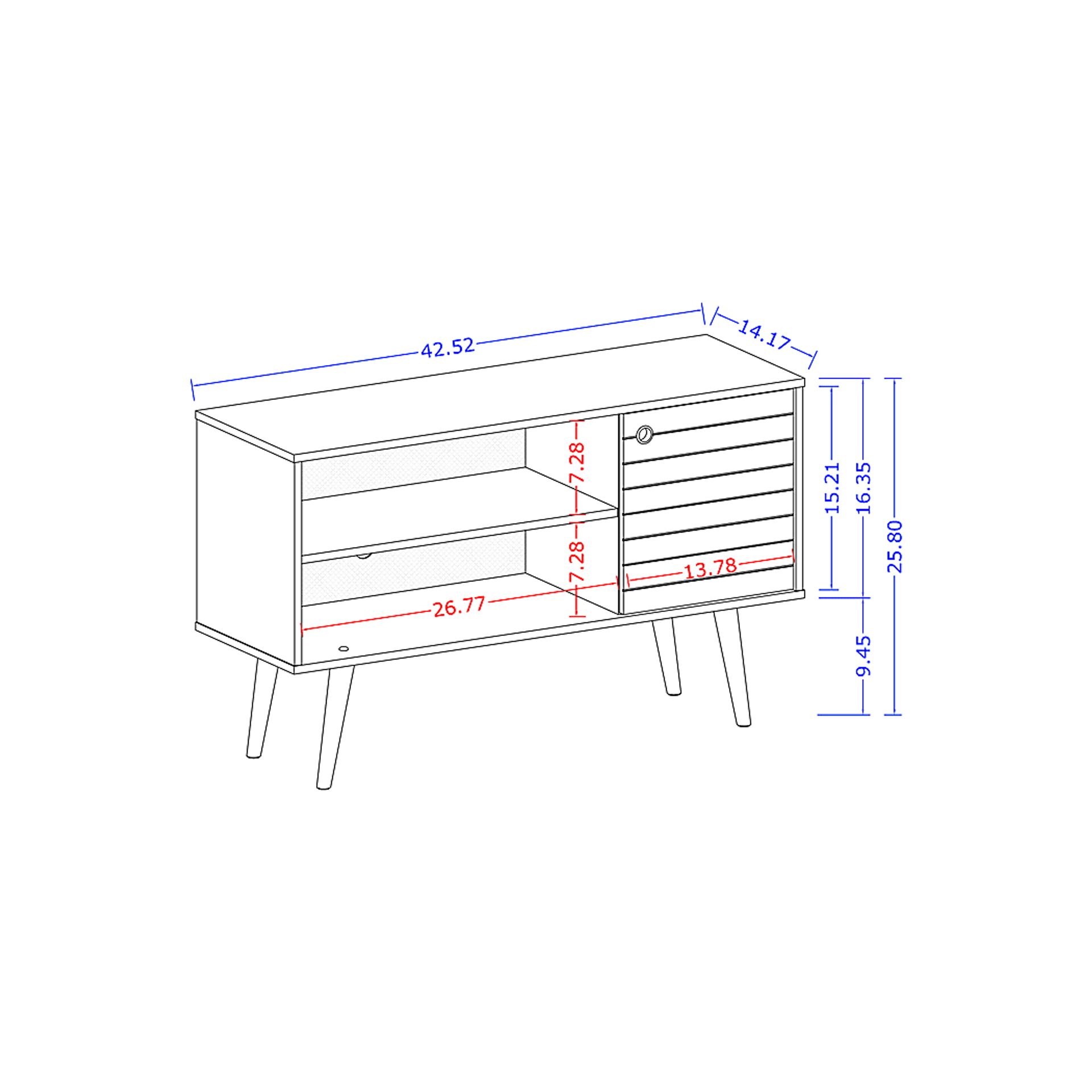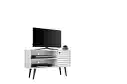 The Flaxmill Mid-Century Modern console is the perfect blend of quality craftsmanship, brilliant design, and purposeful functionality. Featuring 2 open shelf spaces, and one hidden cubby to create the ultimate entertainment center perfect for stashing DVDs, board games, electronics, and media accessories. Free standing and easy to maneuver, this piece will mix well with any decor and its artful grooves will create a statement in any space. Customer assembly is required.