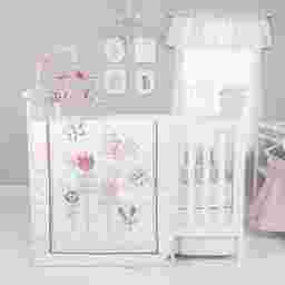 The Floral Fun bedding set brings a sweet look to your nursery, with delicate flowers embroidered on a beautiful soft white eyelet base. Accents of dimensional butterflies flitter alongside floral appliques for a soft, dreamy floral garden quality. The reverse side of the quilt features a sweet pink and white crisscross pattern. This set includes a quilt, crib skirt, fitted crib sheet, changing pad cover, window valance, and diaper stacker. The crib sheet fits a standard 52 x 28 inch crib mattress, and features 8 inch deep pockets with elastic surrounding the entire opening to ensure a secure fit. The changing pad cover is fully elasticized to offer a sleek, tailored fit on a standard 32 x 16 inch contoured changing pad. The diaper stacker can hold up to three dozen diapers, and comes with ties for easy attachment to most dressers and changing tables. Machine wash cold with like colors, gentle cycle. Do not bleach, iron or dry clean. Tumble dry low or line dry. Quilt, skirt, sheet, changing pad cover, diaper stacker, window valance: 100% cotton; Filling 100% polyester; Platform 100% olefin. Window Valance: 56"W x 17"H, Diaper Stacker: 12"W x 8"D x 20"H