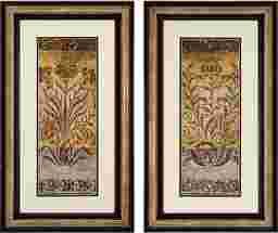 Set of two floral-inspired prints in earthy, neutral colors. The matted prints are set beneath glass, and are accented by a complimenting antique gold-finished frame.