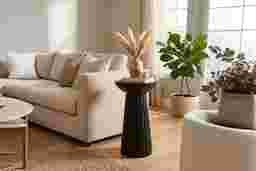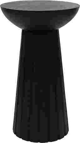 With sculpturally dramatic style inspired by a refined gallery, the Flute Ridge side table is a compact yet bold accent that makes for the perfect sofa sidekick. Finished in a deep matte black, this piece features a smooth round top that provides a clean perch for a drink, book, or décor, while the tapered pedestal base showcases subtle fluted detailing to add texture and dimension.