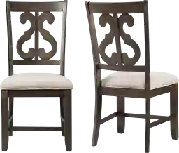 The Foalgarth brown side chair set will be the new standout in your dining room. The back of this chair features an intricate, open-swirl back design, making this duo the reason you update your dining room. The seat is upholstered in a dark taupe and is filled with foam cushion to make for a comfy seat while sitting through long dinners. Detailed piping is featured along the edges of the seat, adding an extra element of design. The back and legs of the chair are finished in a smokey walnut and feature distressed makings throughout. The base of the chair has three stretchers, offering long lasting durability for many years to come. Customer assembly is required.