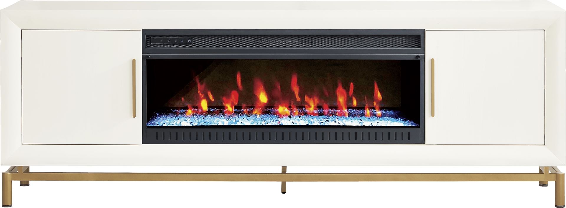 Sleek style meets understated class in the Fontaine entertainment console, a stunningly gorgeous storage and ambiance solution that makes any room a sophisticated retreat. Crafted of wood solids with Mindy veneers, this contemporary beauty's chalk white finish provides both a subtle color and material contrast with the bronze-colored iron base and pulls. On either side, a door conceals two adjustable shelves that are designed to store away electronics, media and some of your favorite things. Rear wire passing holes provide perfect multimedia cable management. In the middle is the piece de resistance: an electric fireplace featuring ambient lighting and heat distribution with a layer of fire crystals that are pure magic.