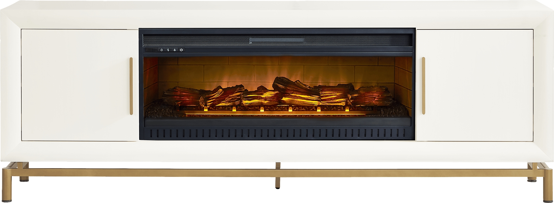 Sleek style meets understated class in the Fontaine entertainment console, a stunningly gorgeous storage and ambiance solution that makes any room a sophisticated retreat. Crafted with mindi veneers, this contemporary beauty's chalk white finish provides both a subtle color and material contrast with the bronze-colored iron base and pulls. On either side, a door conceals two adjustable shelves that are designed to store away some of your favorite things. Rear wire passing holes provide perfect multimedia cable management. In the middle is the piece de resistance: an electric fireplace featuring ambient lighting and heat distribution with a simulated log appearance.