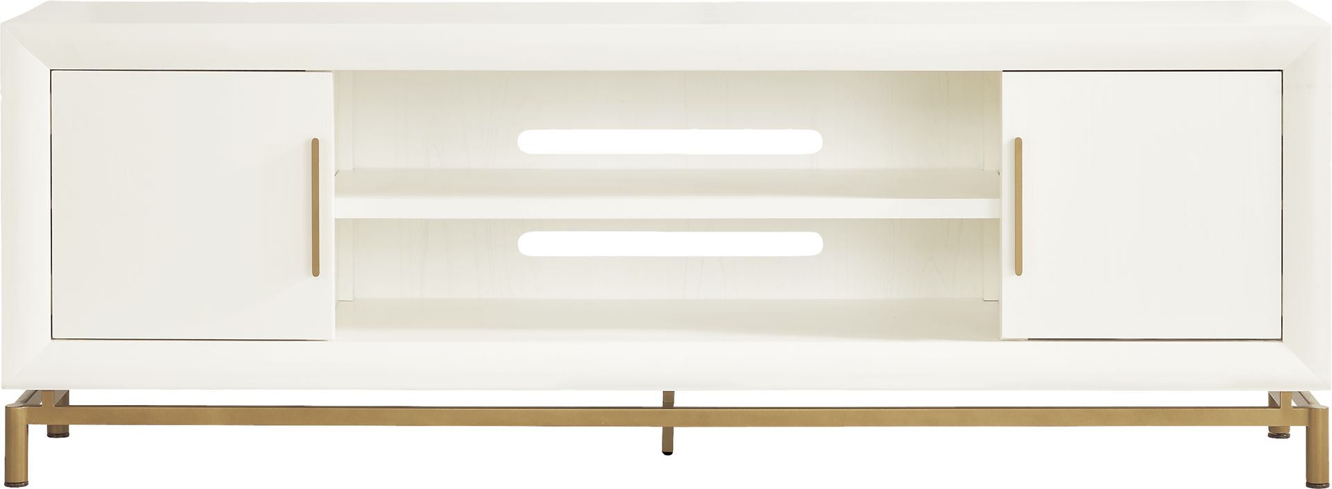 Sleek style meets understated class in the Fontaine entertainment console, a stunningly gorgeous storage solution that makes any room a sophisticated retreat. Crafted with Mindi veneers, this contemporary beauty's chalk white finish provides both a subtle color and material contrast with the bronze-colored iron base and pulls. On either side, a door conceals two adjustable shelves that are designed to store away some of your favorite things. Rear wire passing holes provide perfect multimedia cable management.