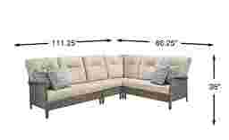 The warm familiarity of a family classic takes its cue from country club chic in the Forest Hills sectional's relaxed angles and deep seats. Weather-resistant frames of aluminum are wrapped in gray all-weather wicker in an understated weave that adds a touch of coastal charm. Thick cushions in UV-resistant beige outdoor fabric offer perfect plushness to match the relaxing slant of the arms.