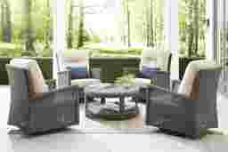 The warm familiarity of a family classic takes its cue from country club chic in the Forest Hills chat set's relaxed angles and deep seats. Weather-resistant frames of aluminum are wrapped in gray all-weather wicker in an understated weave that adds a touch of coastal charm to each swivel chair. Thick cushions in UV-resistant beige outdoor fabric offer perfect plushness to match the relaxing slant of the arms. This set is completed by a glass-topped wicker table in a matching gray finish.