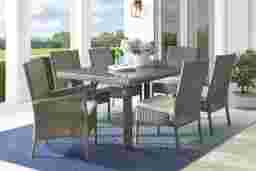 The warm familiarity of a family classic takes its cue from country club chic in the Forest Hills seating set's relaxed angles and deep seats. A handsome 74" x 42" glass tabletop sets the scene in timeless outdoor style. The weather-resistant aluminum frames of the table and each side chair are wrapped in gray all-weather wicker in an understated weave that adds a touch of coastal charm. Cushions in UV-resistant beige outdoor fabric offer perfect plushness to match the subtle tilt of the seats for maximum comfort. Two matching arm chairs complete the set.