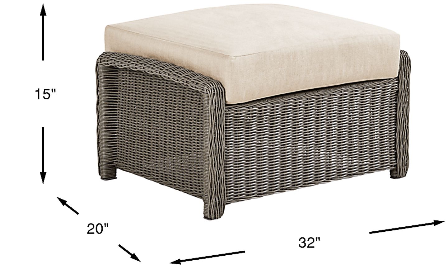With a footprint of 32"w x 20"d, this ottoman is an excellent choice for smaller outdoor spaces. Its rectangular, square-angled design allows it to fit neatly against a wall or in a corner when not in use. Its 15-inch height is also ideal for doubling as a low coffee table for snacks and drinks when topped with a flat tray, providing multi-functional value in a limited square-footage layout.