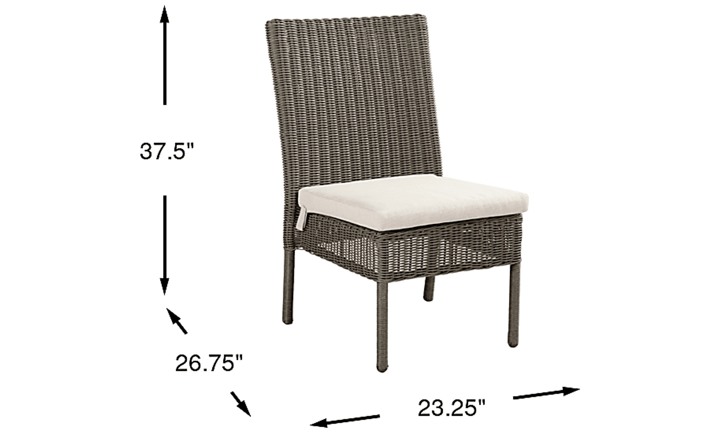 The warm familiarity of a family classic takes its cue from country club chic in the Forest Hills side chair's relaxed angles and deep seat. A weather-resistant frame of aluminum is wrapped in gray all-weather wicker in an understated weave that adds a touch of coastal charm. A comfortable cushion in UV-resistant beige outdoor fabric offers perfect plushness to match the relaxing slant of the seat.
