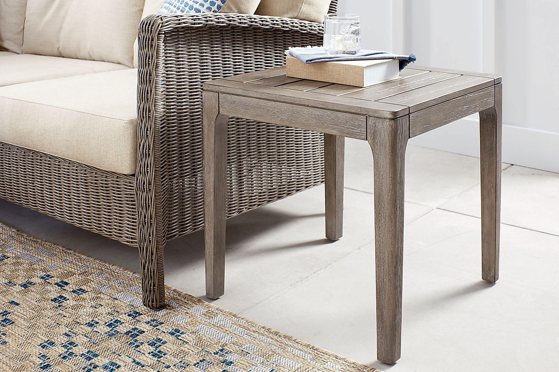 The warm familiarity of a family classic takes its cue from country club chic in the Forest Hills end table's thoughtful design and stylish looks. Solid weather-resistant eucalyptus wood in gray brings this accent a touch of coastal charm. Food, drinks and outdoor essentials have a place to perch on the plank-style top.