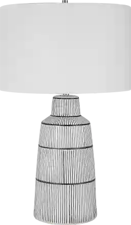 Inspired by the classic nautical stripe knit, the ceramic Frantz Road lamp sports a satin white glaze with rich navy blue stripes and polished nickel plated accents. The hardback drum shade is covered in a crisp white linen fabric. Partial assembly may be required.