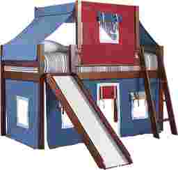 Watch as your child's eyes light up when you present them with the ultimate childhood fantasy. The Freedom Fort loft bed is every child's dream come true, thanks to a fun tent over the upper twin sized lofted bed and a lower level playhouse with an attached slide. Rendered in a rich brown cherry finish with blue fabric that features white, red, and gray accents, this delightful bed's charm is in its attention to detail.