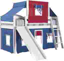 Watch as your child's eyes light up when you present them with the ultimate childhood fantasy. The Freedom Fort loft bed is every child's dream come true, thanks to a fun tent over the upper twin sized lofted bed and a lower level playhouse with an attached slide. Rendered in a classic white finish with blue fabric that features white, red, and gray accents, this delightful bed's charm is in its attention to detail.