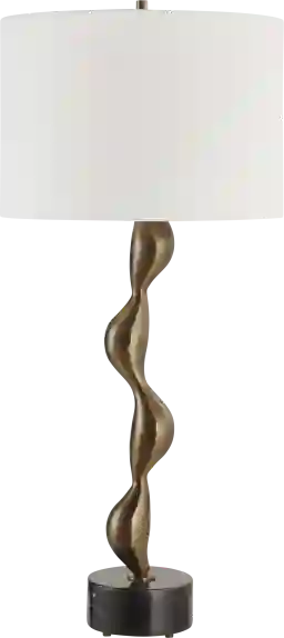 The Freer Cove Bronze Lamp demands attention with its playful and unique profile. The design is crafted from cast iron, finished in a plated warm bronze and displayed on a thick black marble foot, giving this table lamp a rich elegance. A round hardback drum shade made with a crisp white linen fabric completes the piece. Partial assembly may be required.
