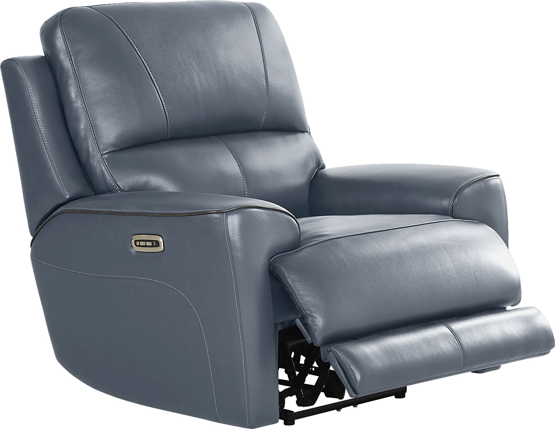 Aristocratic and easily contemporary while boasting a sophisticated timeless silhouette, the Drew and Jonathan Fremont dual power recliner infuses every room with the nostalgic comfort of a well-used library and the warm embrace of shared familial memories. Traditional in style, this piece features blue top grain leather where the body touches made even more relaxing by a single attached cushion and sumptuously padded arms, all highlighted by the contrast welting's stunning visual details. Dual power includes a power adjustable headrest and extended footrest for extra support and leisure. Zero gravity reclining adds the final touch for the ultimate experience in recliner comfort while its control panel includes USB-C and USB-A charging ports to keep your electronics close at hand and at the ready. Upholstery: Top grain leather where the body touches and polyurethane fabric sides and backs. Leather is a durable, low maintenance product; however, general regular maintenance is necessary. To keep your leather clean, vacuum it regularly, removing any dust, and clean it with water and a mild non-detergent soap.