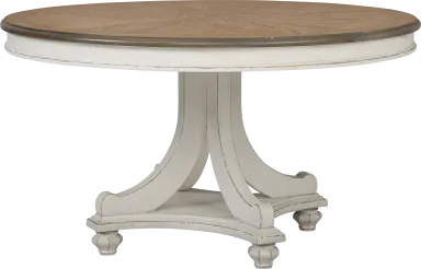 Bring a classically inspired look into your dining space with the French Market dining table. The traditional appearance is enhanced by the chipped white distressed finish giving this piece an antique appeal. An oak veneer 54 inch round table top in a beautiful brown finish provides an exquisite surface to host any gathering. Four stylish oval back side chairs provide comfortable seating for this set. This dining room features a footprint ideal for smaller spaces such as apartments or condos.