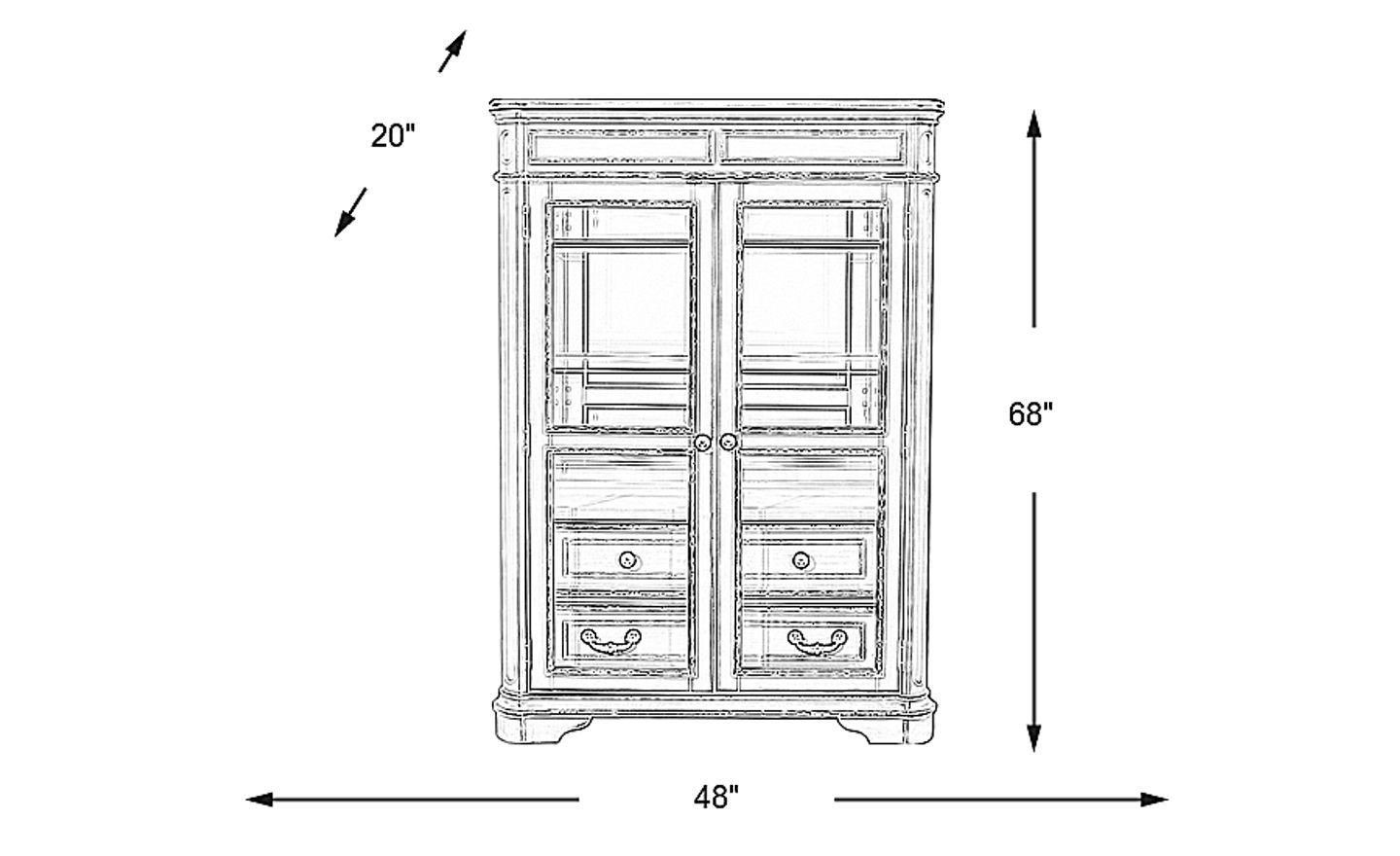 Classic, antique looks are paired with practical storage space for all of your display needs. The chipped white distressed finish creates an aged look that helps bring attention to this piece. Framed glass doors with a stylish bevel, allow for easy display while built in LED touch activated lighting ensures everything is easy to see. Four drawers with English front and French back dovetail joints and brass finish metal hardware provide plenty of additional storage. Adjustable glass shelves guarantee the configuration that works best for your needs.