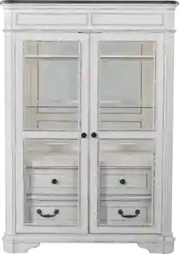 Classic, antique looks are paired with practical storage space for all of your display needs. The chipped white distressed finish creates an aged look that helps bring attention to this piece. Framed glass doors with a stylish bevel, allow for easy display while built in LED touch activated lighting ensures everything is easy to see. Four drawers with English front and French back dovetail joints and brass finish metal hardware provide plenty of additional storage. Adjustable glass shelves guarantee the configuration that works best for your needs.